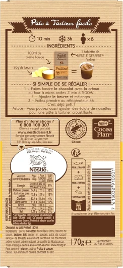 nestle dessert praliné est un chocolat au lait pur beurre de cacao associé à des noisettes fraîchement torréfiées pour un goût unique et équilibré. c'est la tablette idéale pour faire sa pâte à tartiner maison ! avec le plan cacao, nestlé soutient les cultivateurs pour améliorer la qualité de leur cacao.